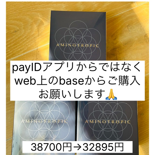 ❣️payIDアプリからではなく、webのbaseショップからのご購入をお願いいたします❣️ お手数おかけしますがよろしくお願いいたします。 ご住所等ご入力時のpayIDからの引用、お支払い方法(payIDあと払い)は、 今まで通りご利用いただけます。 蜂蜜療法を実践されている方へのささやかな応援として。 aminotoropic 3箱のお得なセットです。 12900円×3 38700円→32895円(送料込み)